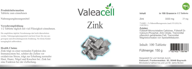 | Zink | 3333 mg | 25 mg | 250% |
